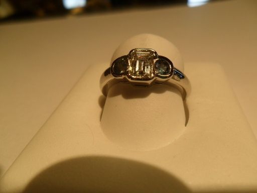 0.5 ct. VS1 quality emerald cut diamond center stone with two round cut bezel set alexandrites set in palladium.