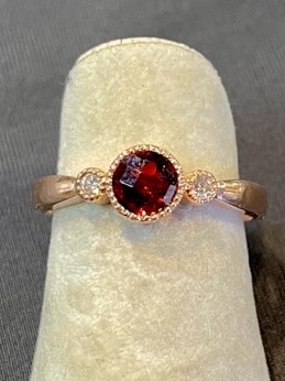 14K rose gold ring set with a 4.2mm garnet and 6 points diamonds.