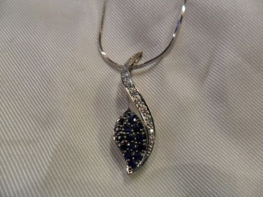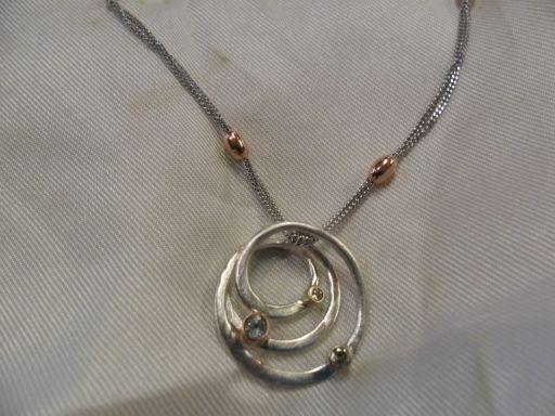 Sterling silver and 14K rose gold swirl pendant with diamond and sapphire.