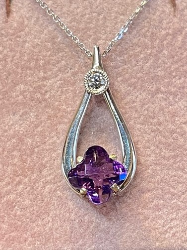 14K white gold pendant set with a lily cut amethyst and 10 points diamond.