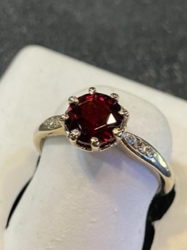 14K white gold ring set with a 6.4mm garnet and 12 points of diamnonds.