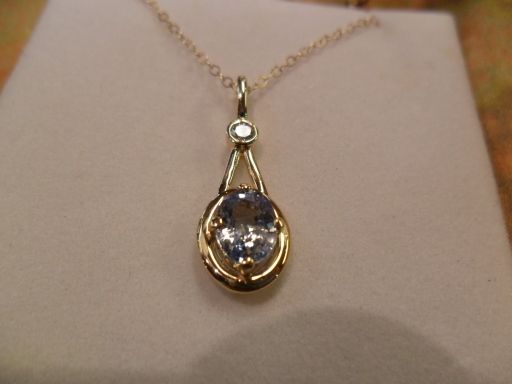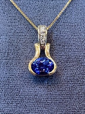 14K yellow and white gold pendant set with a 1.15 carat oval tanzanite and 5 points of diamonds.