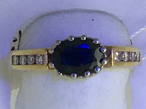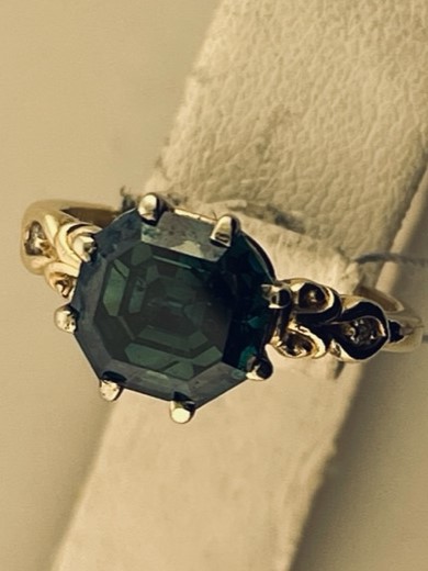 14K yellow gold ring set with a 2 carat blue diamond (color enhanced).