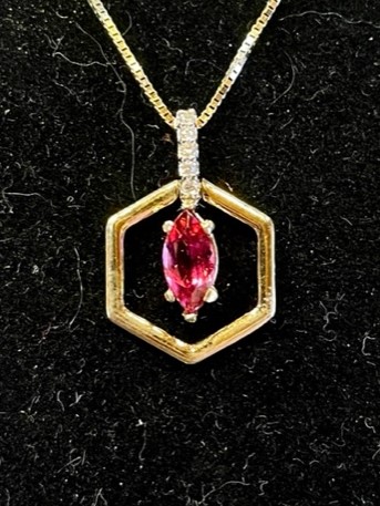 14K yellow gold pendant set with a marquise pink tourmaline and 8 points of diamonds.