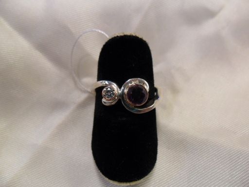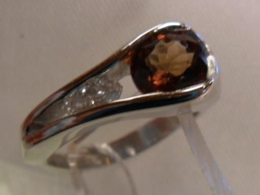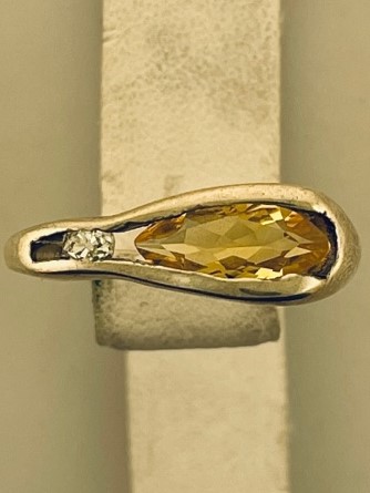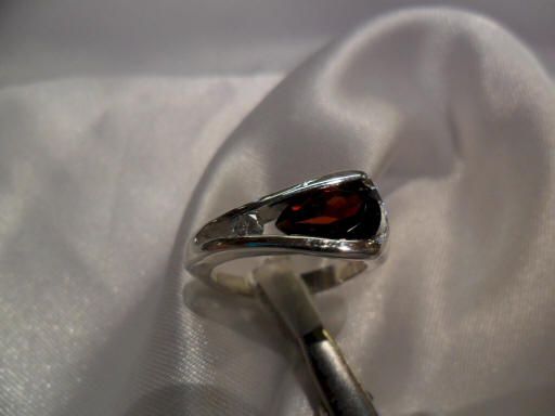 Sterling silver "v" channel ring set with one 8x6mm pear shaped mozanbique garnet and one 0.12 ct. round brilliant cut white diamond.
