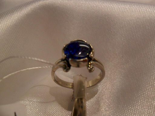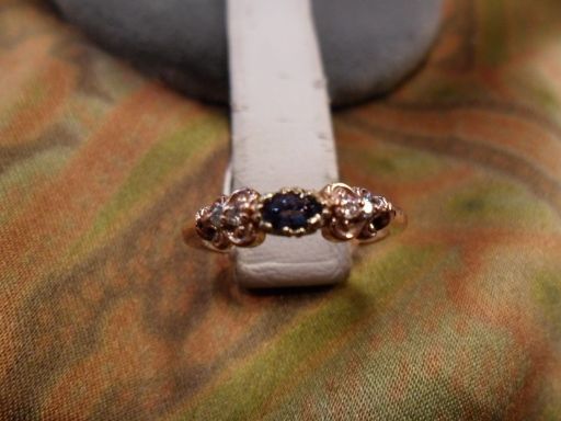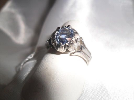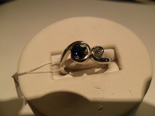 Palladium ring set with a cornflower blue sapphire and 0.15 ct. diamond swirl ring.