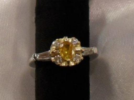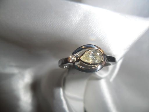 Palladium horseshoe ring with 0.63 ct. natural light yellow pear shaped diamond.