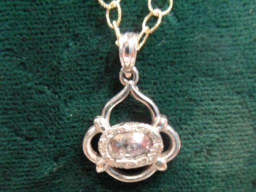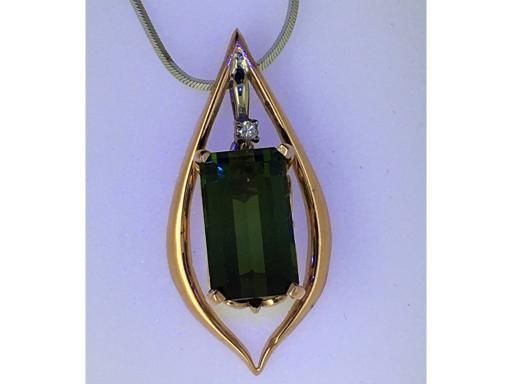 14K rose and white gold pendant set with a Chrome tourmaline and diamond accent.