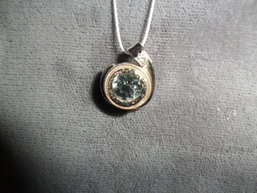 14K white gold pendant with a bezel set 7mm round aquamarine and a 0.02 ct. rose cut diamond accent.