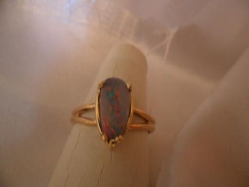 14K yellow gold ring set with a freeform pear shaped boulder opal.