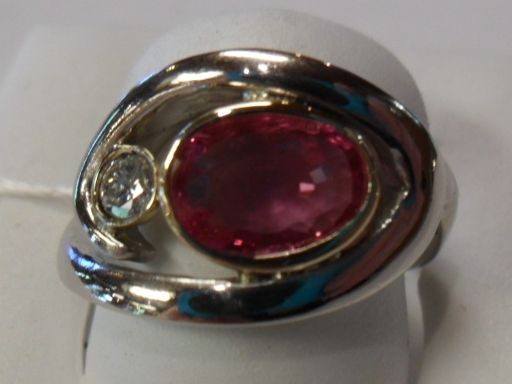 Palladium and 18K yellow gold ring set with a 1.10 ct. pink sapphire and a 0.2 ct. white diamond accent.