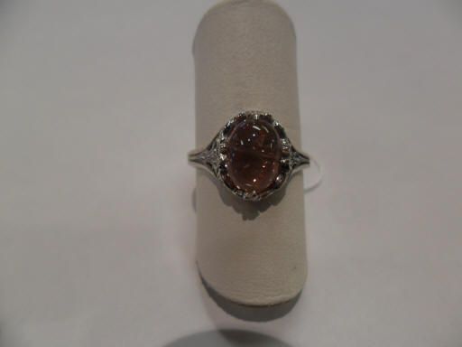 14K white gold art nouveau style ring with oval pink tourmaline cabochon.