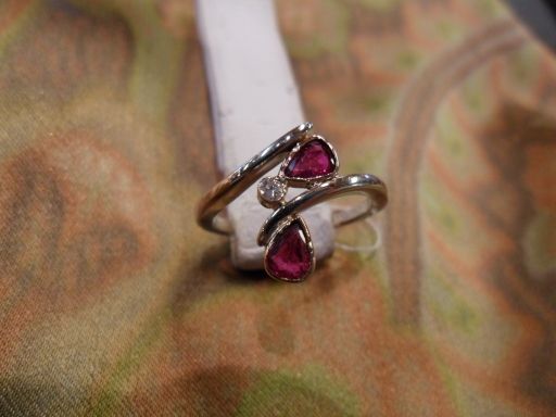 14K white and rose gold swirl ring with two pear shape rubies and diamond.