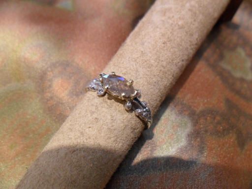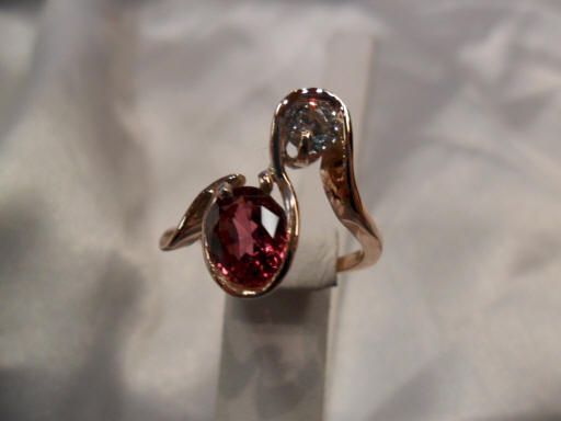 14K rose gold ring set with a marquise 1/3 carat diamond and 2 oval color change garnets.
