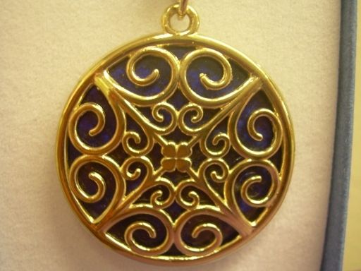 18K yellow gold filigree cut out design pendant backed with a domed blue lapis on a silk cord.