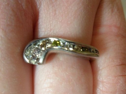 Graduated round brilliant cut diamonds channel set in palladium with a European rocker bottom, alternating colors champagne, yellow, and white. Large diamond ending the pattern weighs 0.5 ct.