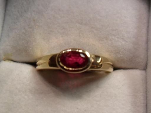 0.78 ct. oval A grade ruby bezel set in 14K yellow gold ring. Center stone could be replaced with a different stone of choice.